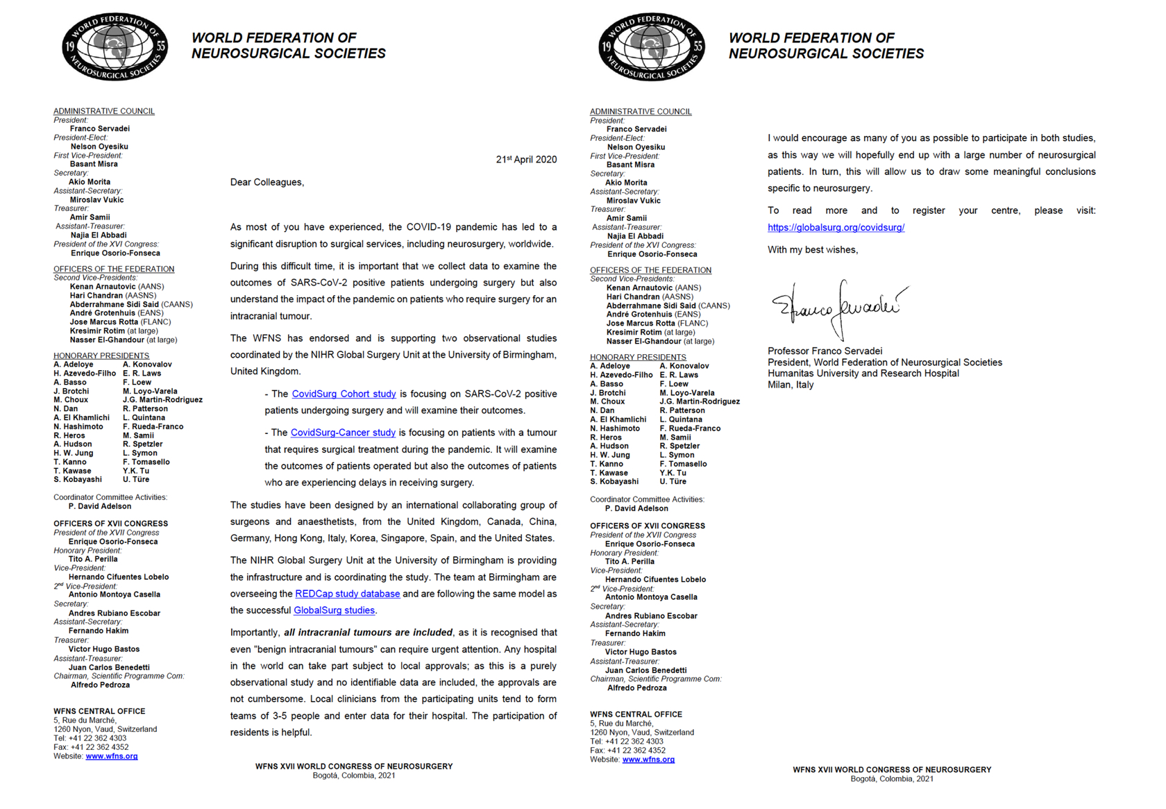 The World Federation of Neurosurgical Societies is supporting the @CovidSurg cohort and cancer studies and is encouraging all neurosurgeons to participate. To sign up visit https://globalsurg.org/covidsurg/.