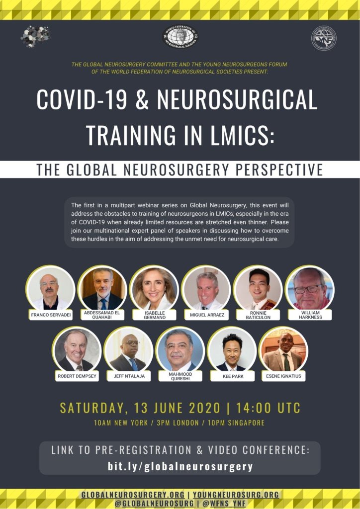“COVID-19 and Neurosurgical Training in LMICs: The Global Neurosurgery Perspective” will be the first webinar of this series on June 13th, addressing the obstacles to training of neurosurgeons in low and middle-income countries, especially in the era of COVID-19 when already limited resources are stretched even thinner.